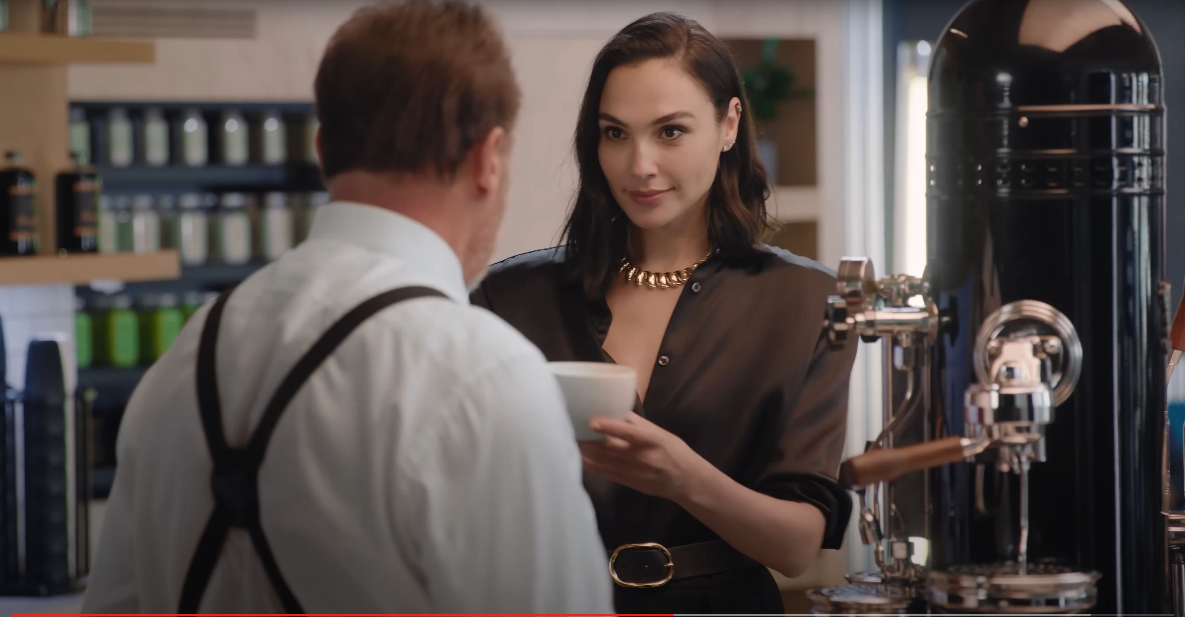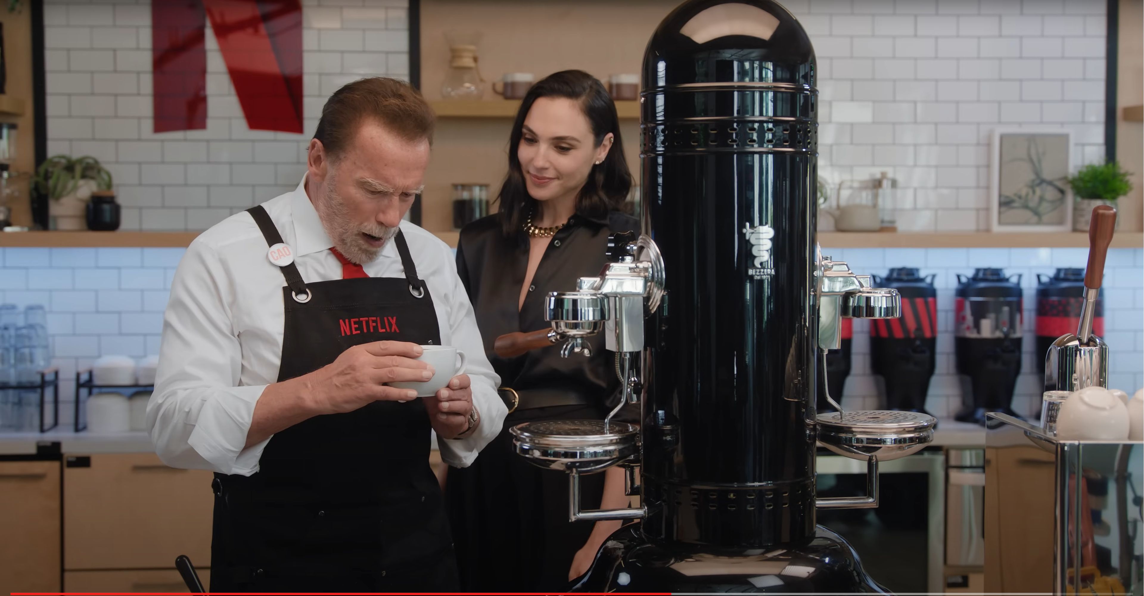 Gal Gadot serving Arnold Schwarzenegger a cup of Caffe Latte from a Bezzera Verticale Black Eagle 2 Group Coffee Machine